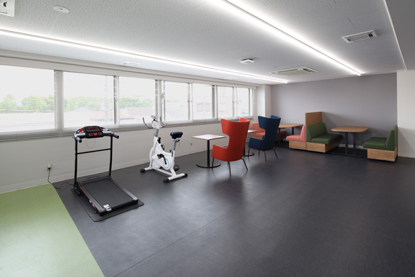 休憩スペースにはカフェスペースもあり、リラックスした時間を過ごすことが可能。さらに、トレーニング機器も設置されており、業務の合間に体を動かしてリフレッシュする社員も多くいます。
