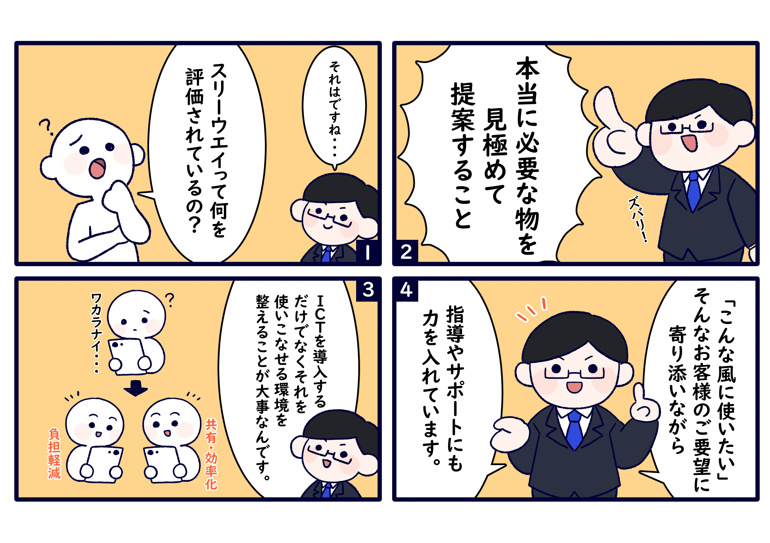 やはり、お客様の“本当に必要なもの”を見極めて提案する姿勢でしょうか。例えば、教育現場ではタブレットやPCを導入するだけでは十分とは言えません。実際に先生方や生徒が使いこなせる環境を整えることが大事なんです。そのために、機器の選定だけでなく、導入後の指導やサポートにも力を入れています。